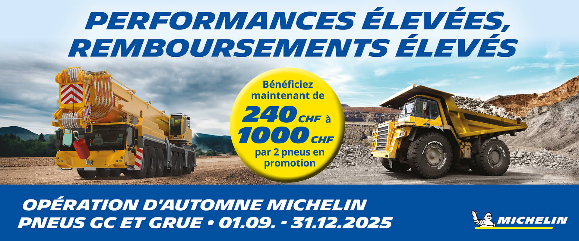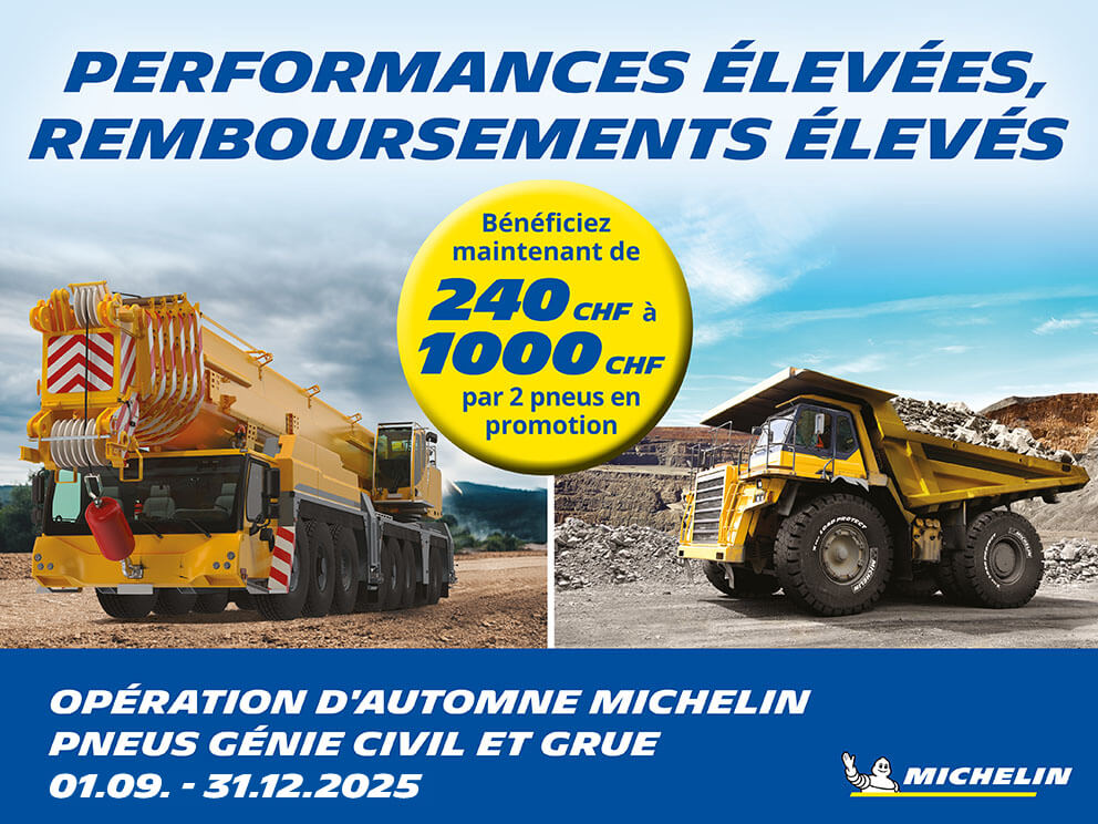 Dans la période de l'opération, achetez chez le revendeur de votre choix au moins deux pneus MICHELIIN génie civil ou grue définis.